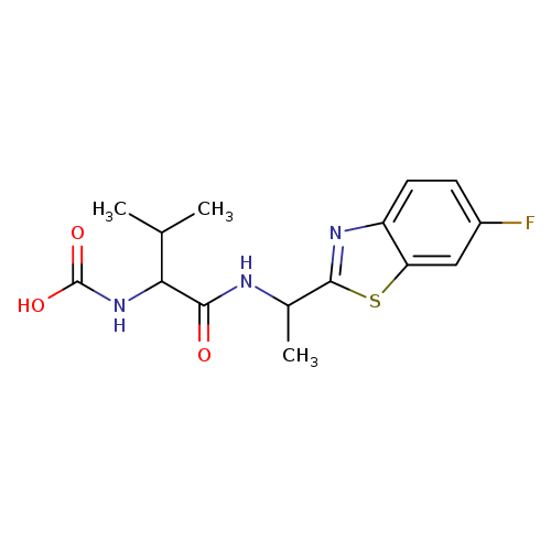 Matched synonyms: … N-[(1S)-1-[[[(1R)-1-(6-fluoro-2-benzothiazolyl)ethyl]amino]carbonyl]-2-methylpropyl]carbamic acid ... [(1S)-1-{[(1R)-1-(6-fluoro-1,3-benzothiazol-2-yl)ethyl]carbamoyl}-2-methylpropyl]carbamate ... [(1S)-1-{[(1R)-1-(6-fluoro-1,3-benzothiazol-2-yl)ethyl]carbamoyl}-2-methylpropyl]carbamic acid …
